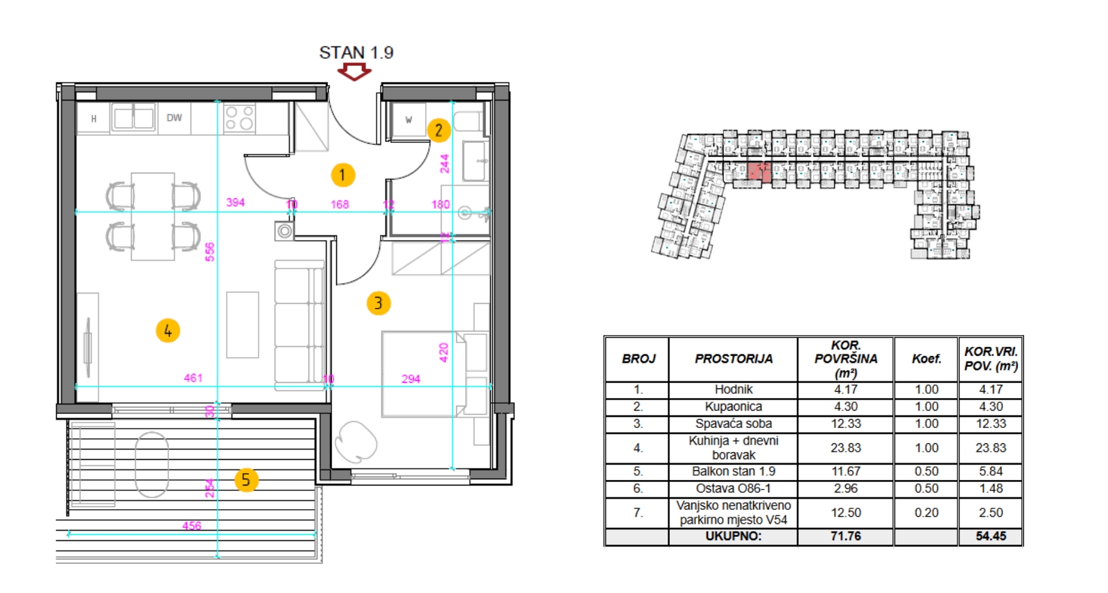 Jednosobni stan površine 54.45 m² nalazi se na 1. katu luksuzne stambene zgrade Centurion Residences u Umagu.