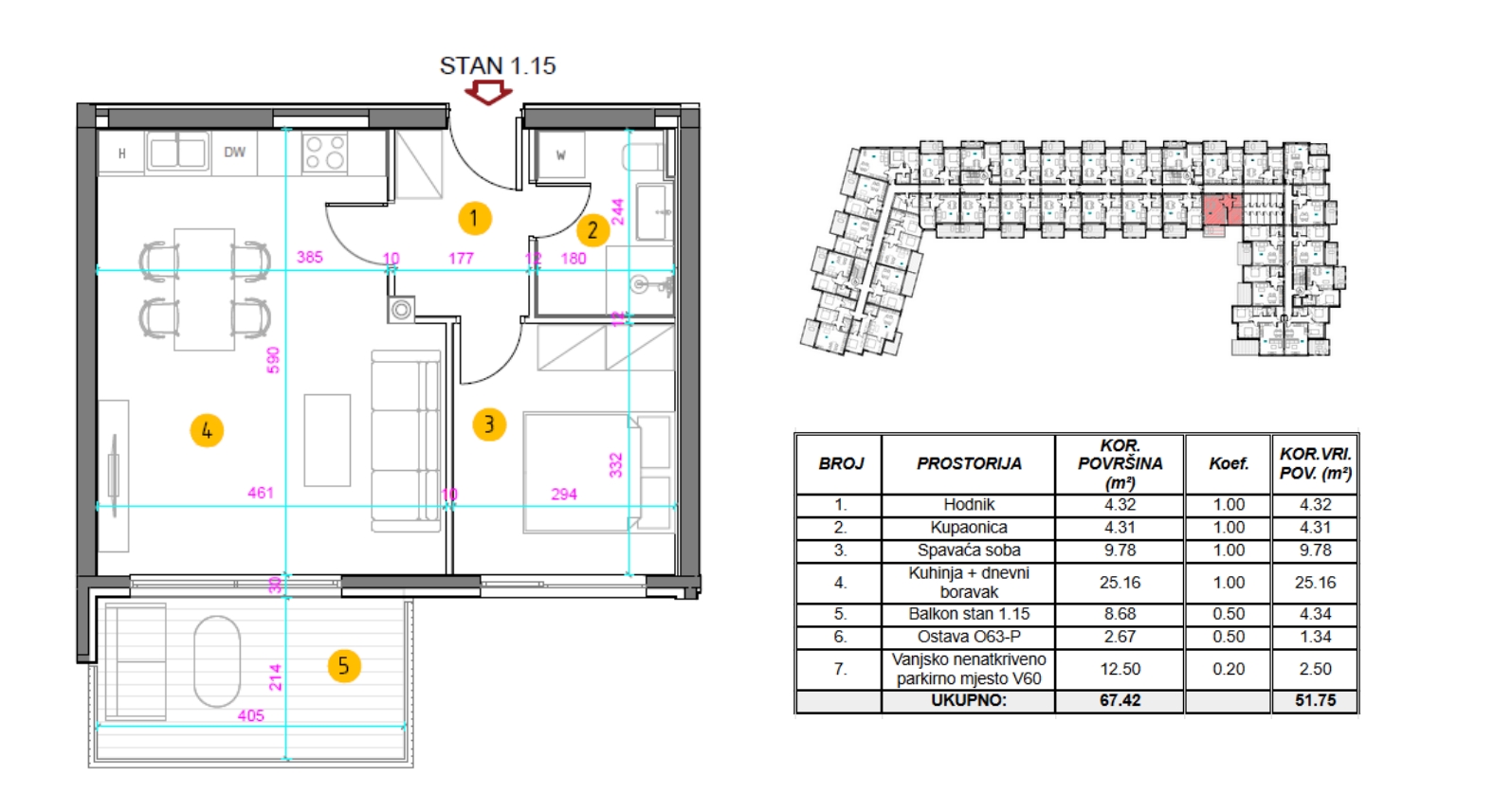 Jednosobni stan površine 51,75 m² nalazi se na 1. katu luksuzne stambene zgrade Centurion Residences u Umagu.