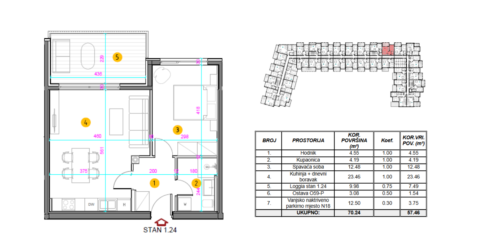 Jednosobni stan površine 57,46 m² nalazi se na 1. katu luksuzne stambene zgrade Centurion Residences u Umagu.