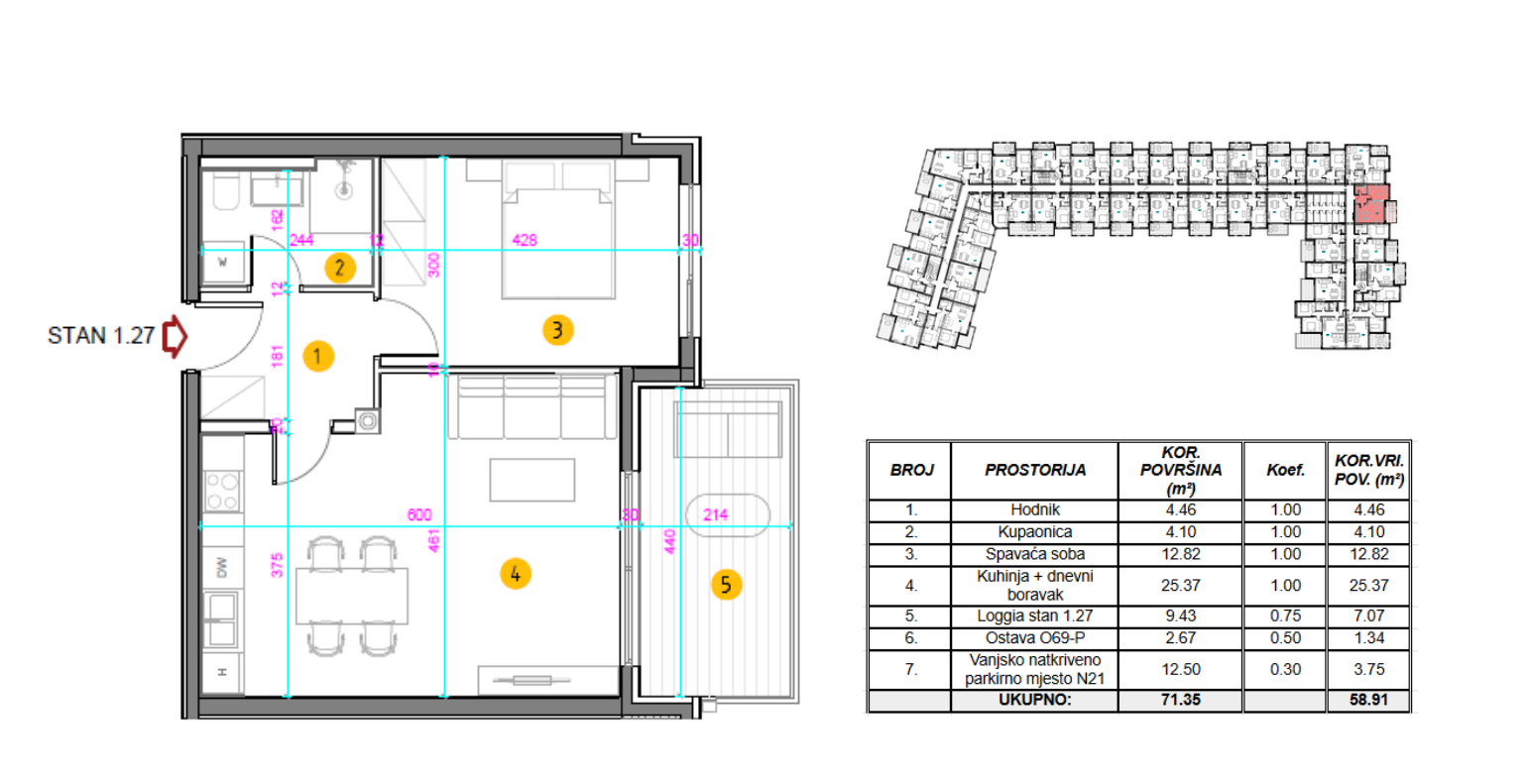 Jednosoban stan površine 58,91 m² nalazi se na 1. katu luksuzne stambene zgrade Centurion Residences u Umagu.