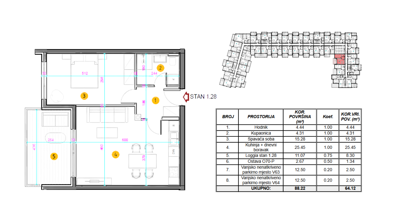 Stanu pripadaju dva parkirna mjesta od 12.50 m2 i ostava.
