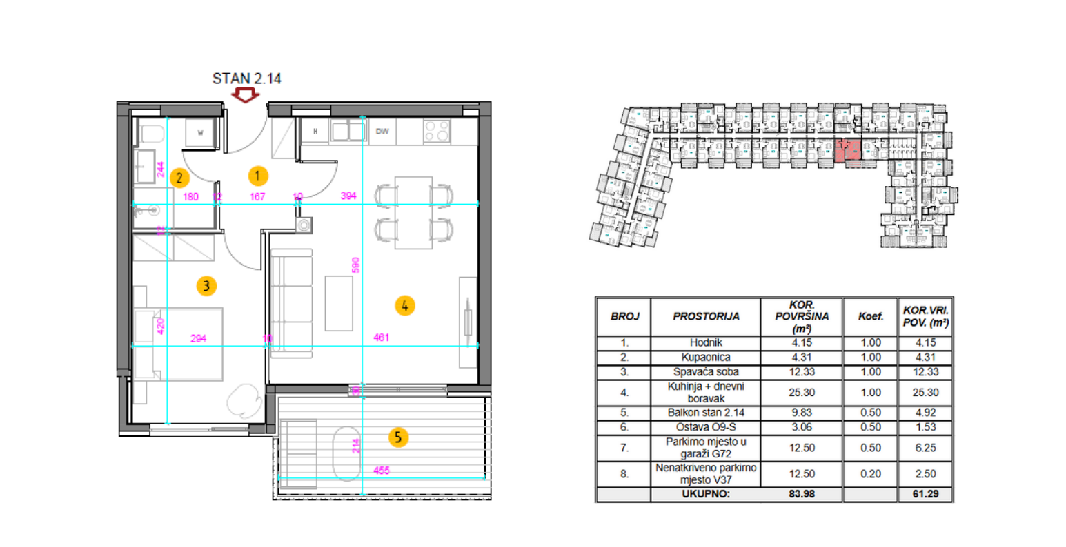 Stanu pripada parkirno mjesto od 12.50 m2, garaža od 12,50 m2 i ostava.