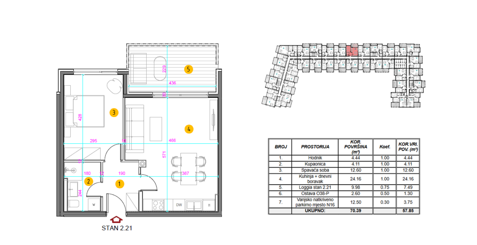 Jednosoban stan površine 57,85 m² nalazi se na 2. katu luksuzne stambene zgrade Centurion Residences u Umagu.