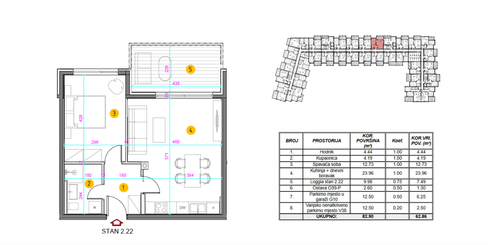 Stanu pripada parkirno mjesto od 12.50 m2, garaža od 12,50 m2 i ostava.