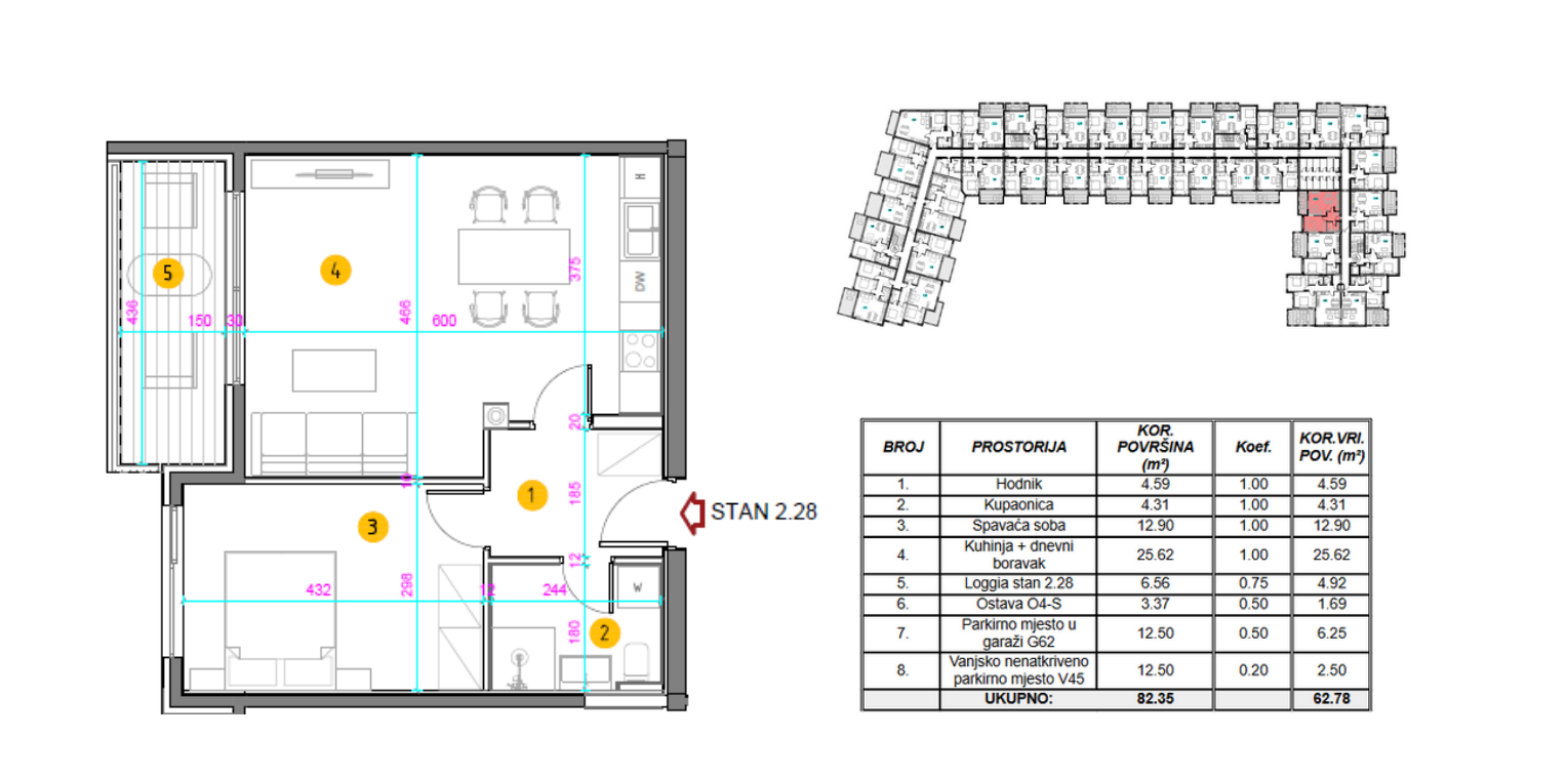 Stanu pripada parkirno mjesto od 12.50 m2, garaža od 12,50 m2 i ostava.