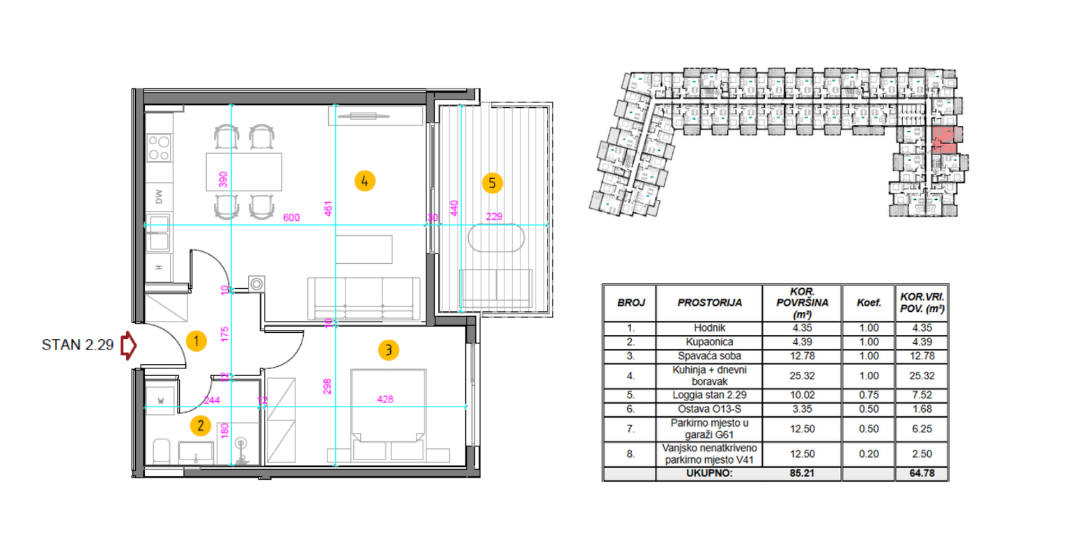 Stanu pripada parkirno mjesto od 12.50 m2 i garaža od 12,50 m2 i ostava.