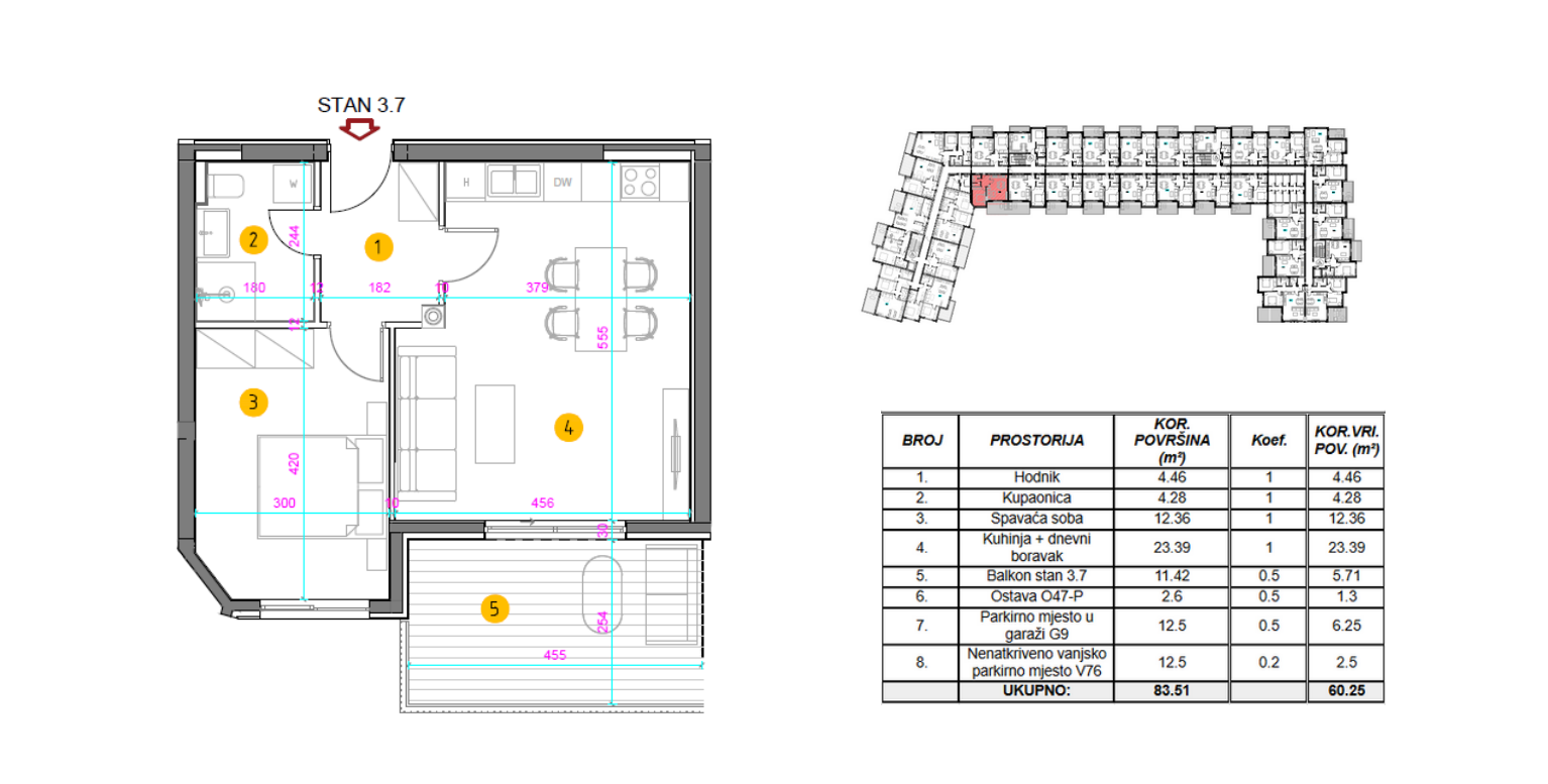 Stanu pripada parkirno mjesto od 12.50 m2, garaža od 12,50 m2 i ostava.