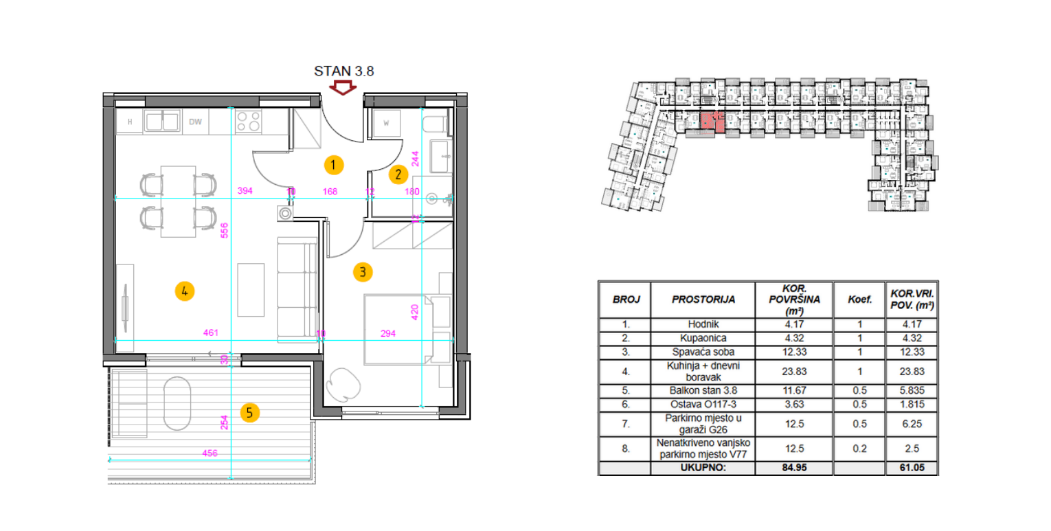 Stanu pripada parkirno mjesto od 12.50 m2, garaža od 12,50 m2 i ostava.