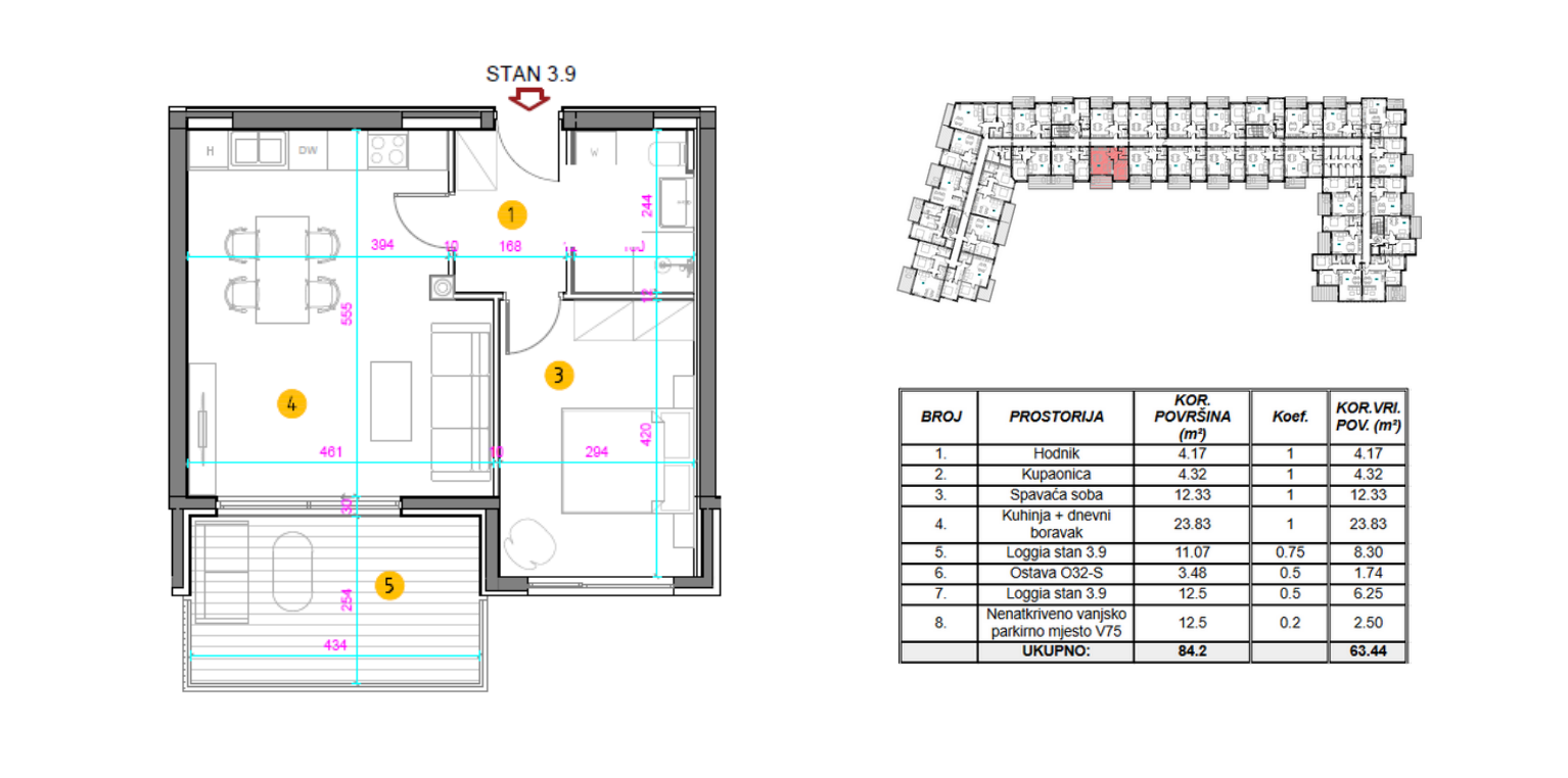 Jednosobni stan površine 63,44 m² nalazi se na trećem katu luksuzne stambene zgrade Centurion Residences u Umagu.