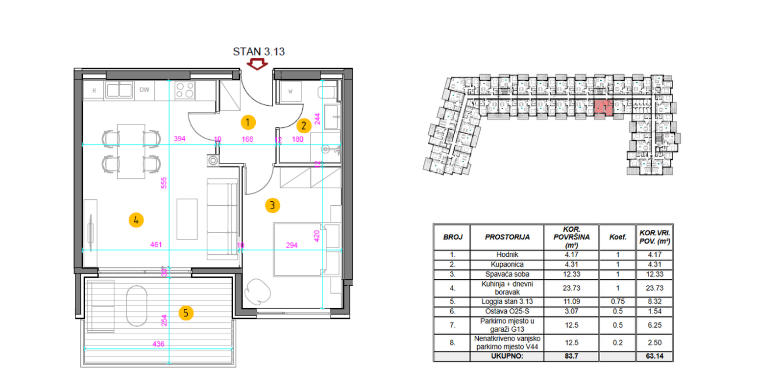 Jednosobni stan površine 63,14 m² nalazi se na trećem katu luksuzne stambene zgrade Centurion Residences u Umagu.