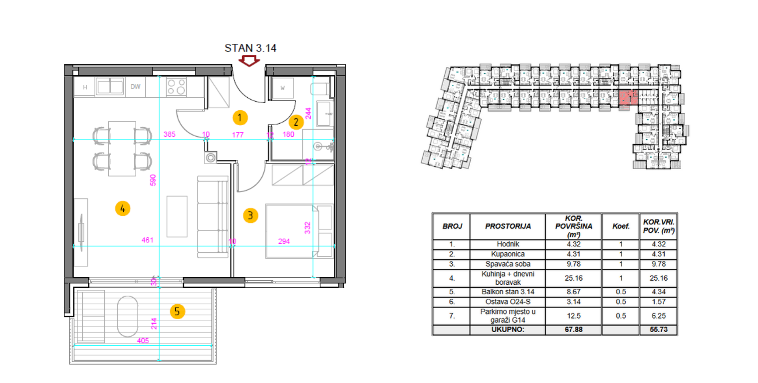 Dvosobni stan površine 55,73 m² nalazi se na trećem katu luksuzne stambene zgrade Centurion Residences u Umagu.