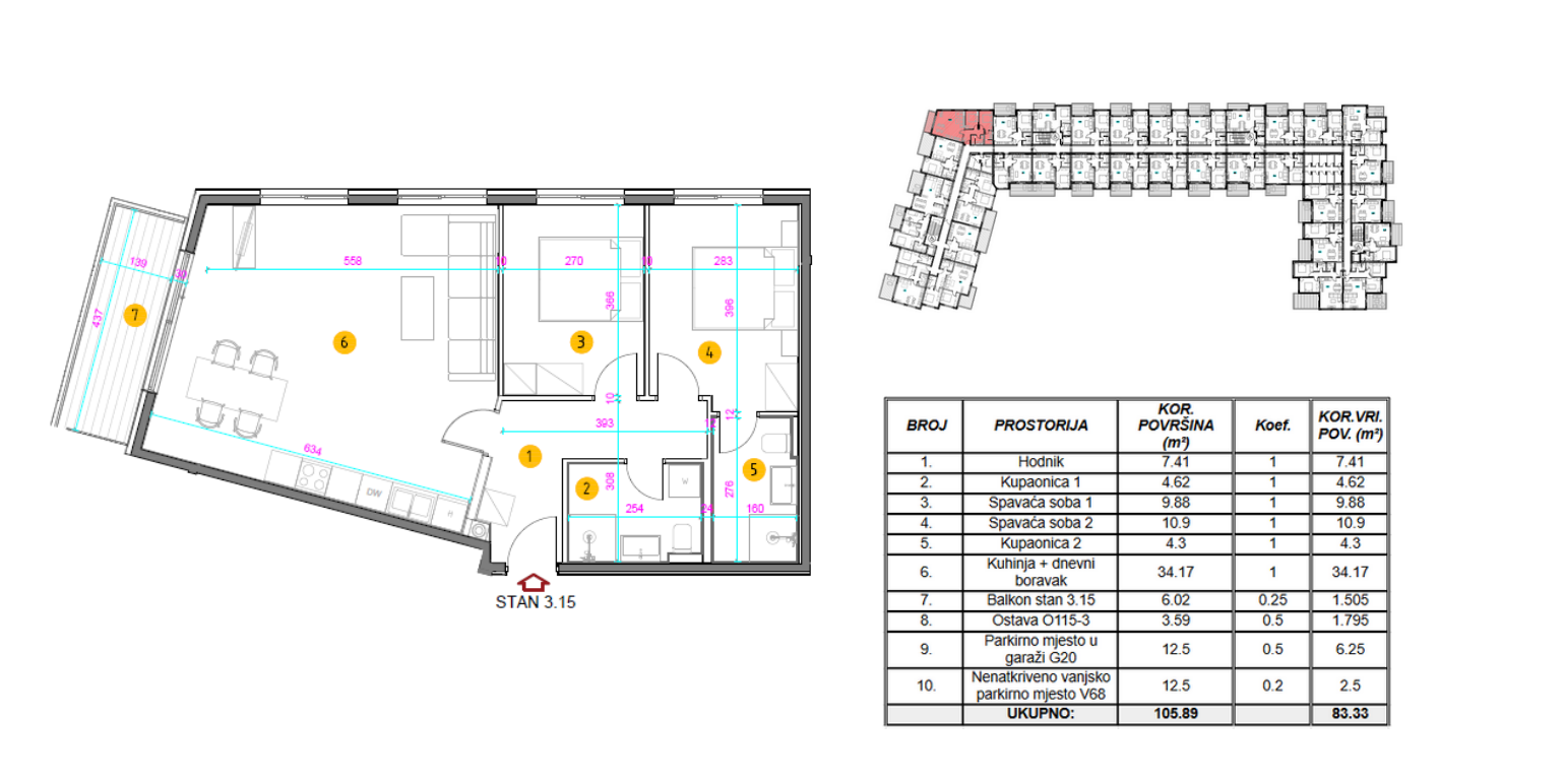 Stanu pripada parkirno mjesto od 12.50 m2, garaža od 12,50 m2 i ostava.