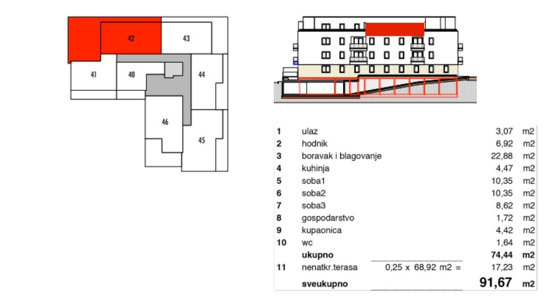 Uz stan je obvezna kupnja garažnog parkirnog mjesta od 18,36 m² po cijeni od 31.186,60 eura te spremišta od 5,19 m² po cijeni od 7.488,00 eura.